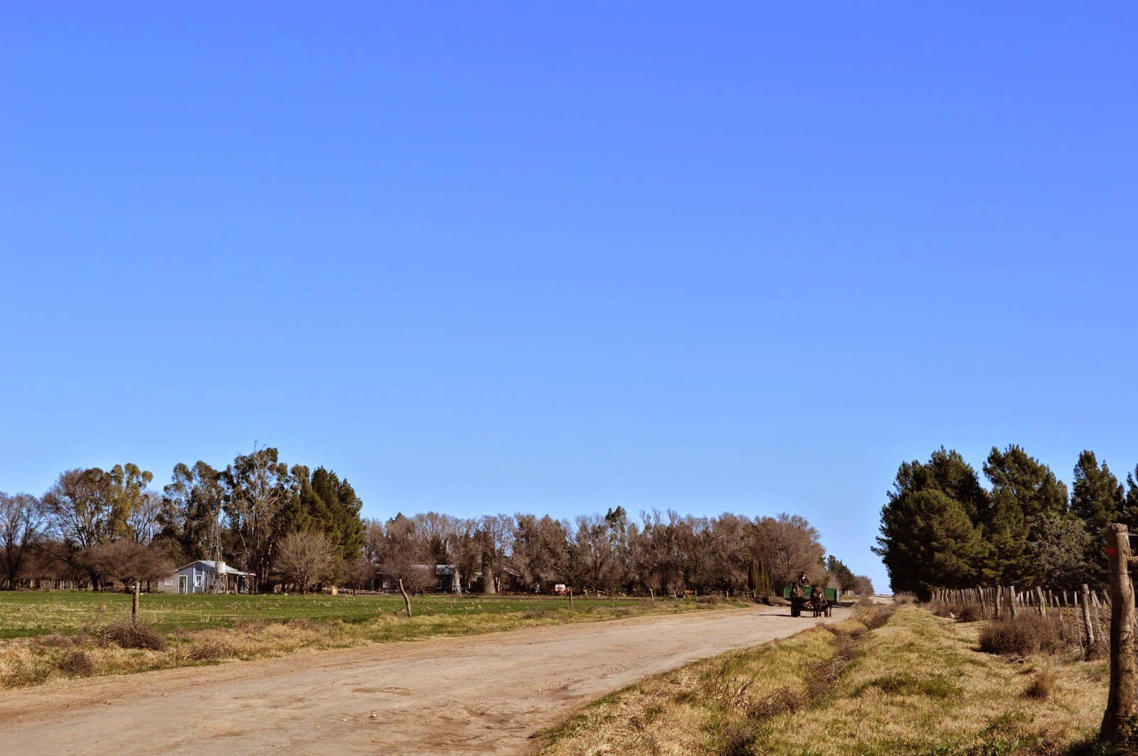 Llegaba desde Santa Rosa, la capital provincial. Cuando estaba acariciando los 200 kilómetros en el odómetro de mi camioneta (la mitad por pistas de tierra), vi a lo lejos de estas desiertas llanuras una gran fila de árboles que me confirmaban la presencia de vida humana. Hacia allá me dirigí.